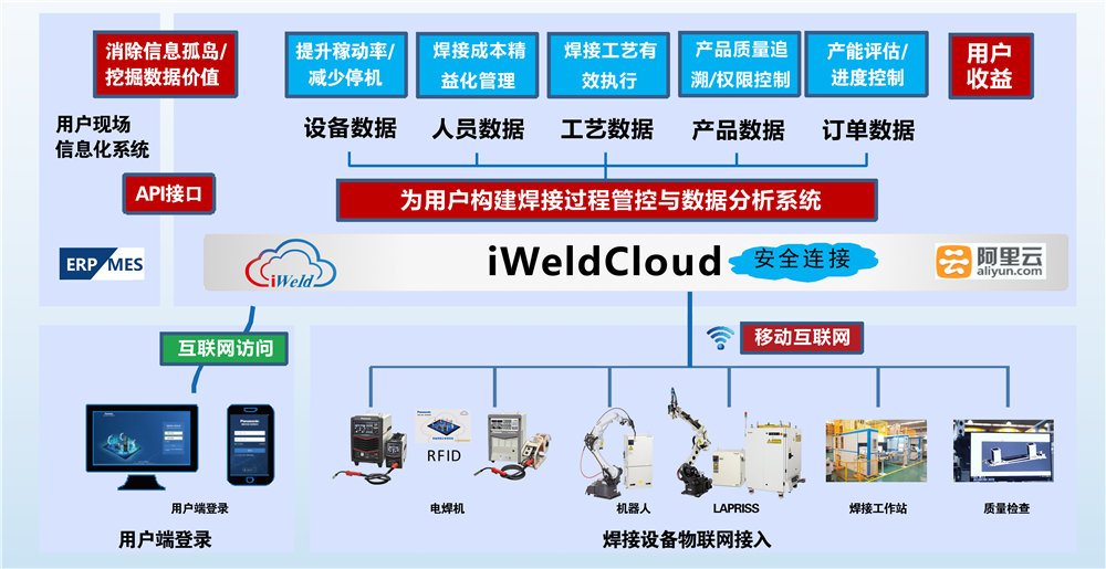 包含基础数据库和工艺数据库,其中焊接数据库根据输入的材质、厚度、接头形式、焊接位置、焊接设备等信息,输出焊接工艺规范参数,主要包括焊丝种类与直径、气体种类与流量、焊接电流、焊接电压、焊接速度、摆动参数、脉冲参数、多层多道参数、起收弧焊接电流电压、收弧时间等,通过知识推理专家系统实现焊接路径和工艺参数自动规划,自动完成工艺设计和工艺流程优化。数据库可根据工艺评定数据、生产验证数据、物联网数据,利用控制器和传感器采集各种参数和质量数据进行自学习和不断完善。