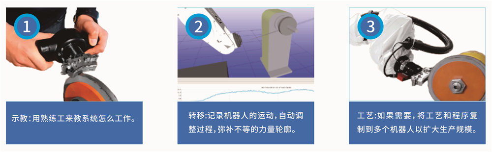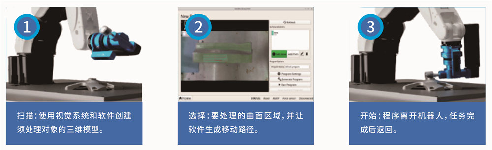 该系统利用3D视觉技术拍照自动建模,只需简单地在操作界面上标注需要打磨区域,即可快速高效在复杂的工件表面上实现全自动打磨。系统自动运算生成精准的抛光轨迹,再利用六轴力值传感器进行精准力控,保证加工品质稳定。该技术将帮助客户快速提升生产效率,实现流动生产,保证品质稳定,提高市场竞争力。