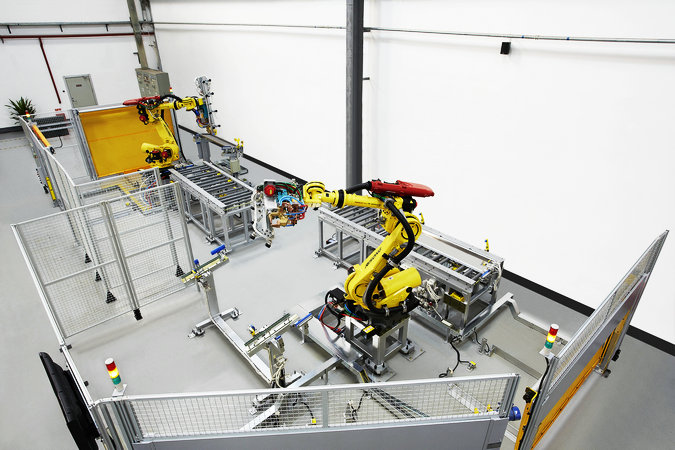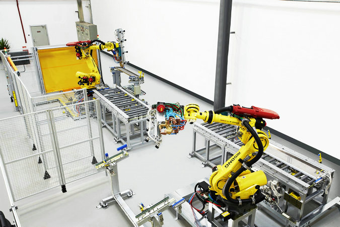 采用高柔性六轴机器人对工件进行搬运,焊接,码垛功能,焊接是采用中频逆变的焊机,能根据工件的实际情况进行焊接电流的自动调整。