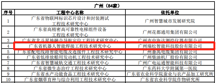 On February 24, 2020, Guangdong Robotic Intelligent Welding Engineering Technology Research Center formed byGuangzhou Risong Intelligent Technology Holding Co., Ltd. was publicized in the List of 2019 Guangdong Provincial Engineering Technology Research Centers and officially approved to be established.