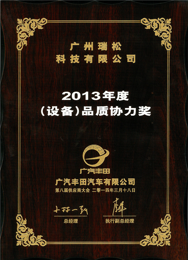 2014年3月18日,瑞松科技获得由广汽丰田汽车有限公司颁发的“2013年度(设备)品质协力奖”。瑞松科技以产品技术为核心,以客户为导向,获得了众多客户的认可。