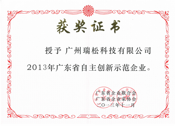 【2013年度】瑞松科技荣获“广东省自主创新示范企业”称号