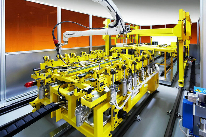 整个系统为全自动焊接生产,除了上料是人工进行操作外,采用机器人对工件进行点固,全方位焊接,同时工件的物料为自动化物流,全程不需要人工进行干预,出来的工件已经是整齐码垛放置好,采用松下的机器人进行焊接,飞溅小,焊接效率高。