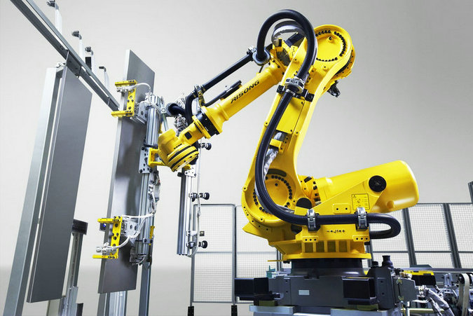 对原有的人工操作工艺进行了自动化设备的导入,采用了全自动的铆钉机配合自动化的伺服系统对工件进行全自动铆接,保证铆钉工序的稳定性,同时工件配置了自动的输送线,工件可以在输送线上进行定位和输送。采用高柔性伺服日本FANUC6关节165KG机器人配合自动螺丝机进行导靴的安装,整个螺丝安装的过程有检测监控,可以检测螺丝的扭力是否能达到设计的要求,让后自动反馈给系统进行参数的记录。同时采用了自动的打包设备,自动上纸皮,自动包装扎带,为工件的码垛和搬运提供了保护。通过以上一系列的动作和控制,可以保证工件的安装是符合质量要求的。同时可以自动识别不同款的工件,自动调取自动程序运行,具有柔性化生产的效果。