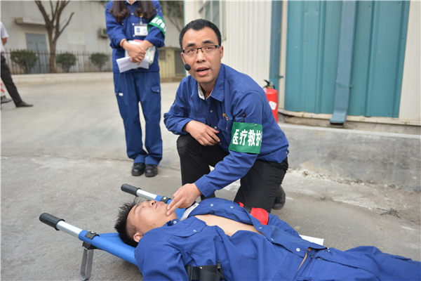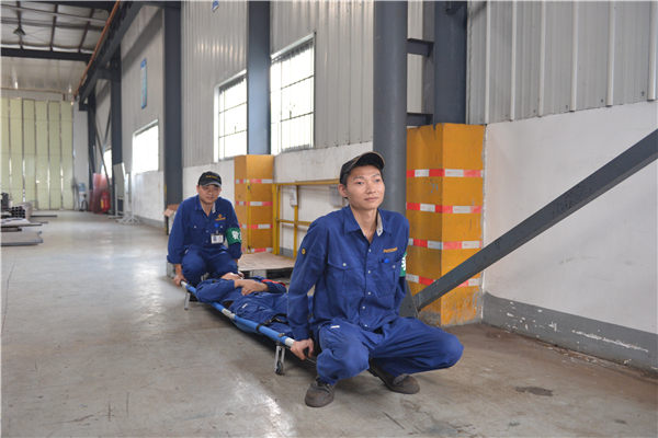 救治伤员:同事们准备把扮演伤员的同事运送到安全地带。